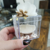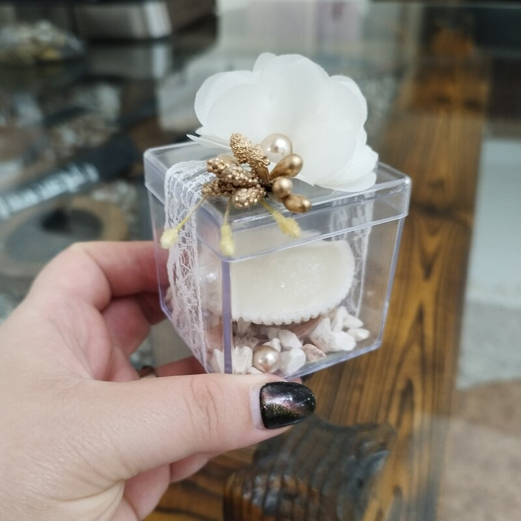 جعبه پلکسی زیبا در ابعاد ۵در ۵ داخلش شمع صدفی و سنگ ریزه و مروارید کار شده و روی جعبه با تور شیک گل و مروارید تزیینشده