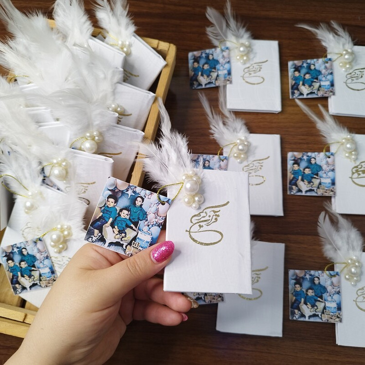 گیفت قرآن ۵در ۷ با تزیینات پر و مروارید لوکس دارای ۱۵آیه و دارای آیة الکرسی