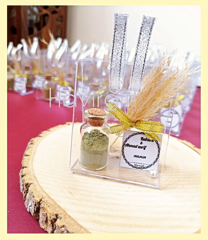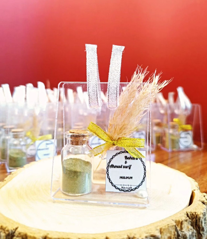 با تزیینات بگ گل پامپاس و مروارید و چاپ ویژه شما و شیشه زیبای حنای خشک و دسته بگ