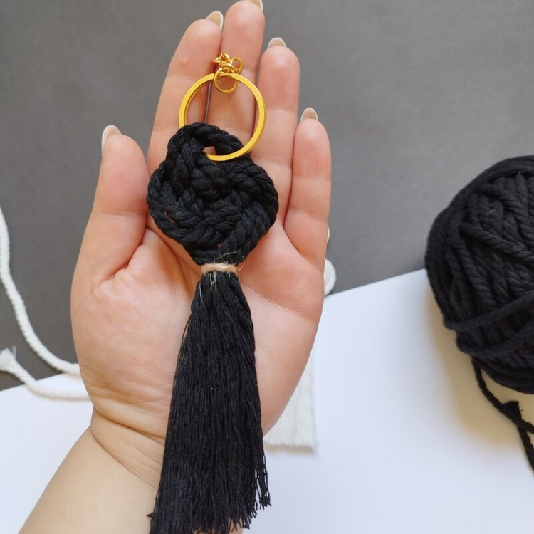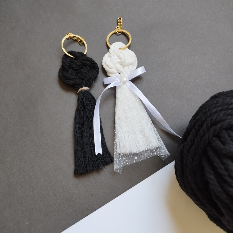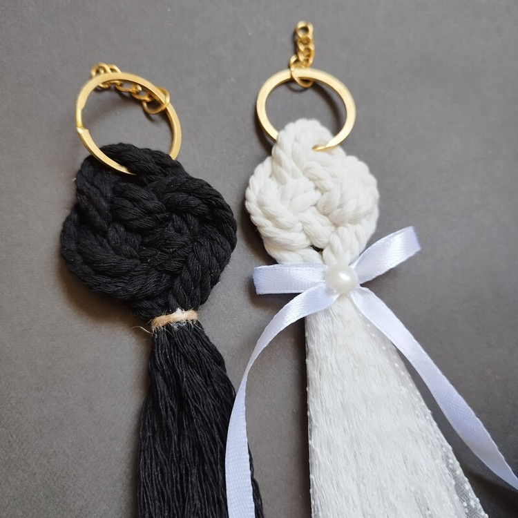 جنس کار از پنبه مکرومه اعلاست رنگ سفید و مشکی دقیقا مطابق همین بافت انجام میشه با سر کلیدی طلائی گیفت خوشگل عروس دامادمون از جاکلیدی ها بهم متصل میشن یا به صورت تک هم میتونید سفارش بدید ارتفاع کار ۱۳ در عرض ۴ .
