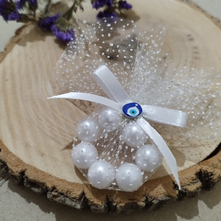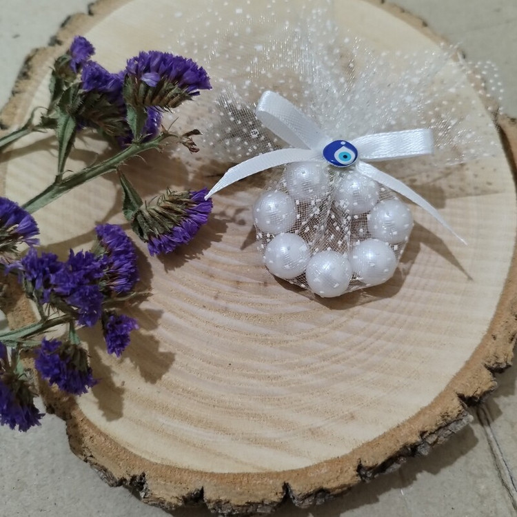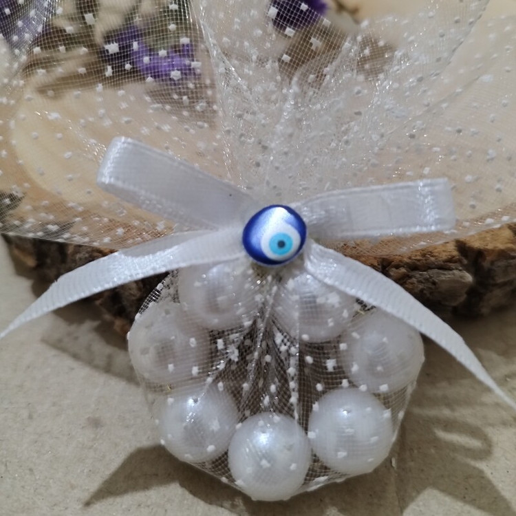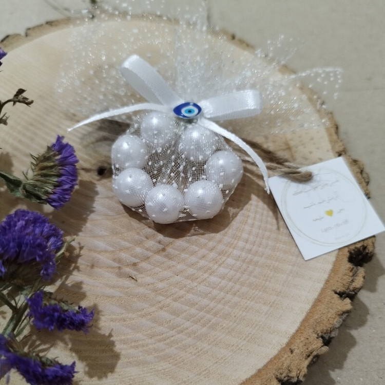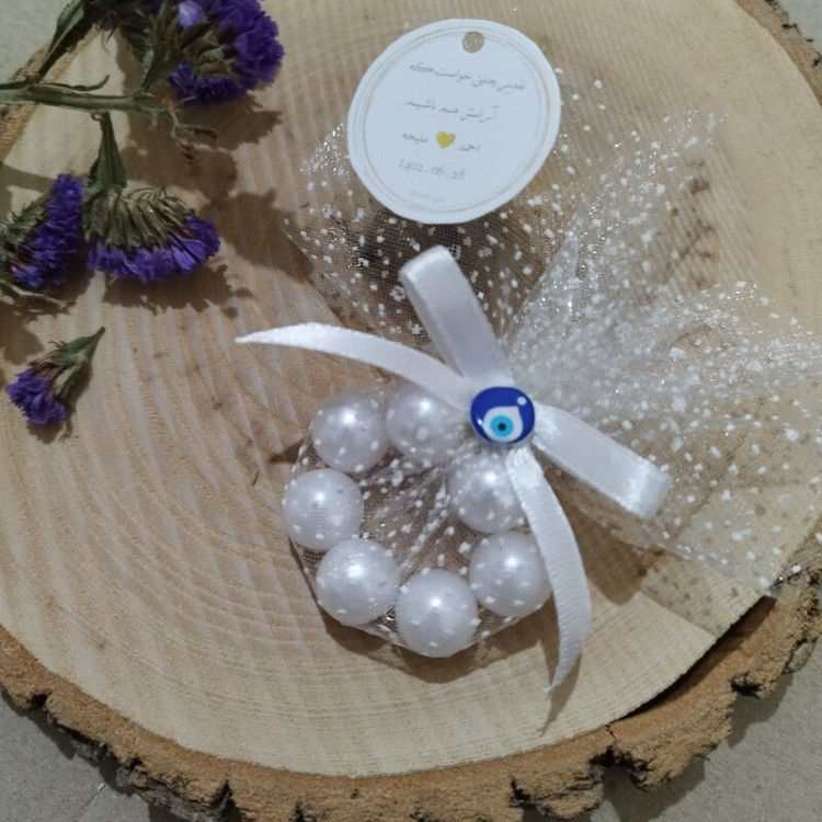 گیفت زیبا و اقتصادی مروارید با تزیین تور ،ربان و چشم نظر چاپ تگ اسم