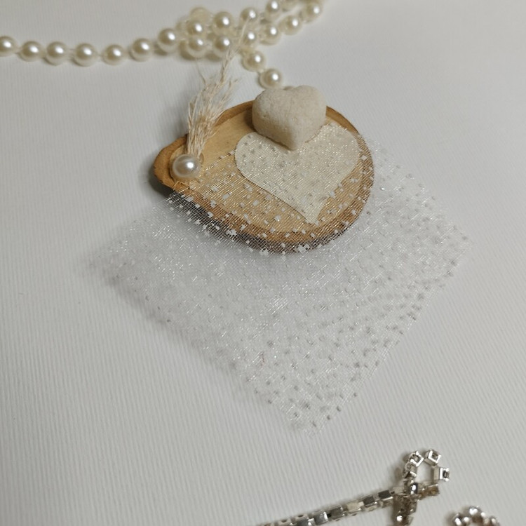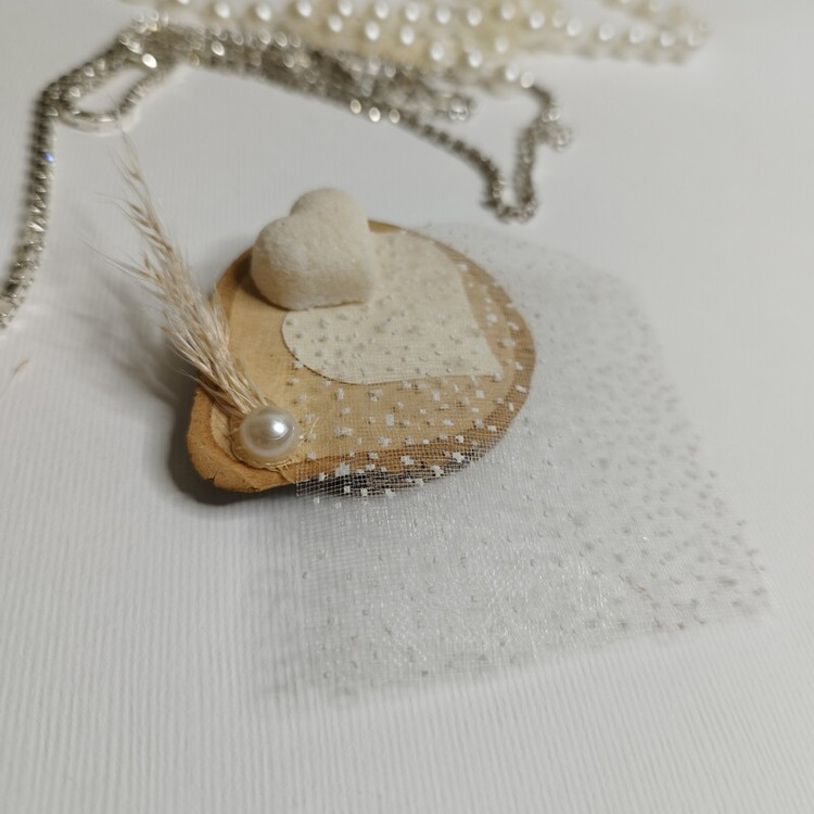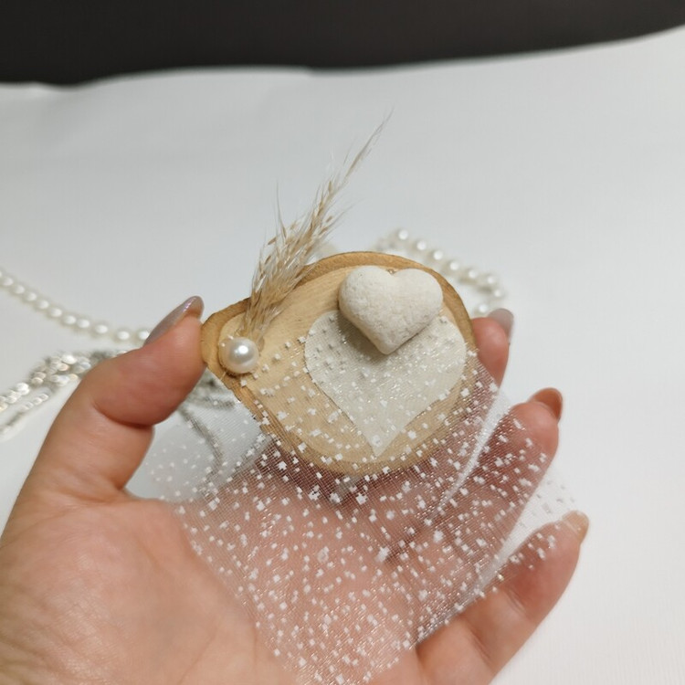 گیفت زیبای چوبی در سایز ۶در۷ با تزیین قلب ۲,۵سانتی، تور ، گل پامپاس و تگ اسم آماده دست نویس و مروارید